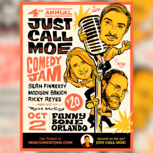 Get ready to laugh for a great cause at the 4th Annual JustCallMoe Comedy Jam! Join us for a night of non-stop comedy featuring the hilarious Madison Bakich, Ricky Reyes, and Sean Finnerty — with Orlando favorite Ross McCoy as your host. This special one-night event benefits the Yellow Brick Road Foundation, supporting families of children with congenital heart disease. Great comics, great cause, great night — don’t miss it!